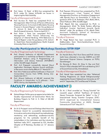 NEWS LETTER n Prof. Ketan D. Patel of BCA has completed his n Prof. Poonam Chhaniwal has completed her Ph.D. Faculty of Computer Applications n Dr. Harsha V. Jariwala secured first prize at GCeMP